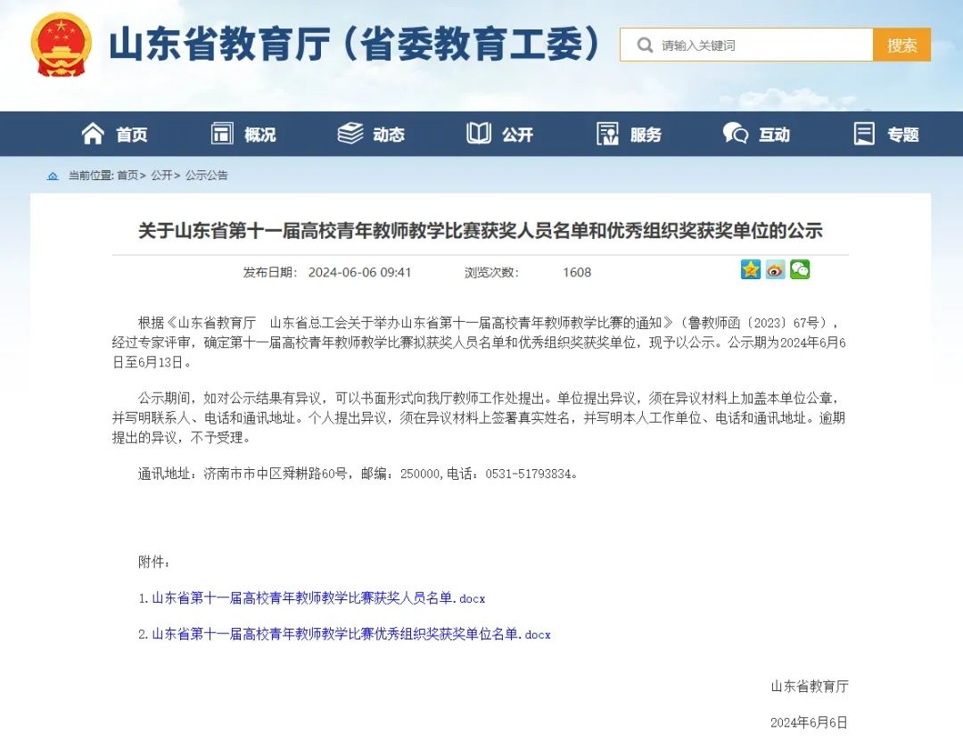 6月6日,山东省第十一届“超星杯”高校青年教师教学比赛结果公示,我校轻纺化工学院教师齐建获工科组一等奖,人文学院教师李天旭和教育学院教师任洁获文科组三等奖。
