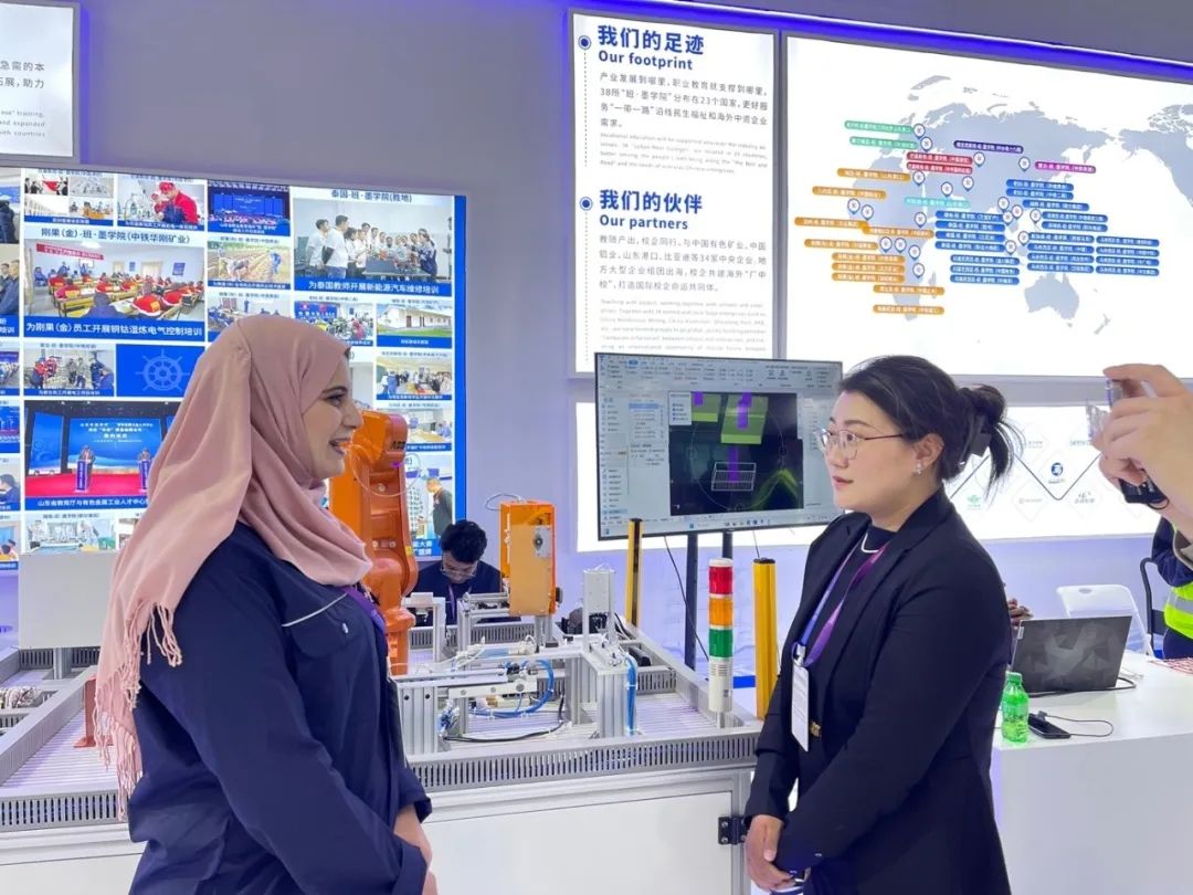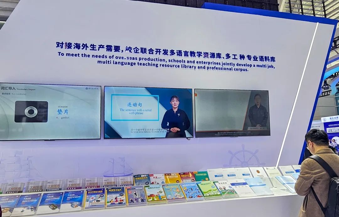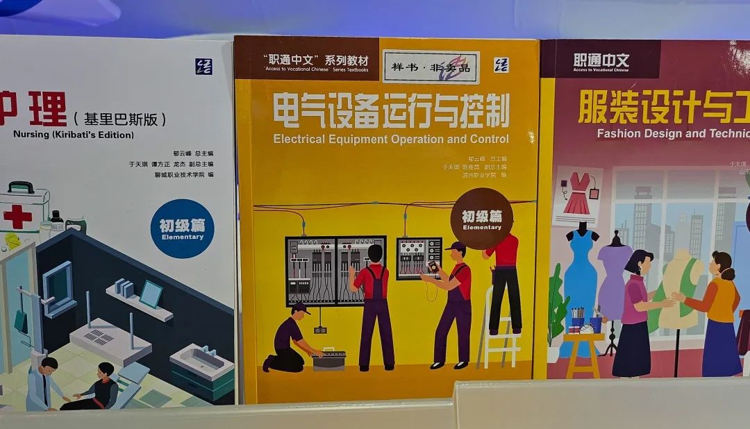 此外,在校企联合开发多语言教学资源库多工种专业语料库展区,我校展出了“职通中文”《电气设备运行与控制》系列教材并向全球推介,该教材适用于中国“走出去”企业电气设备运行与控制岗位本土员工的在岗语言和技术培训,有效提升本土员工中文交际能力、技能操作水平,实现优质教育资源共享,为促进多彩文明交流互鉴,讲好中国故事贡献更多滨职力量。