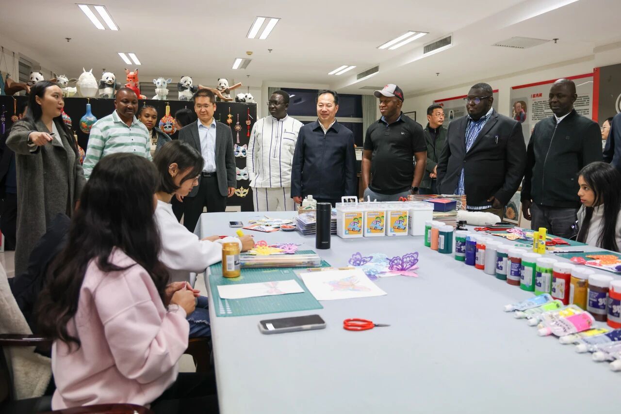 在滨州市现代原创美术研究院,客人一行观摩了留学生非遗手工艺课堂。几内亚来宾对中国的剪纸艺术表现出浓厚兴趣,并与来自不同国家的留学生亲切互动。