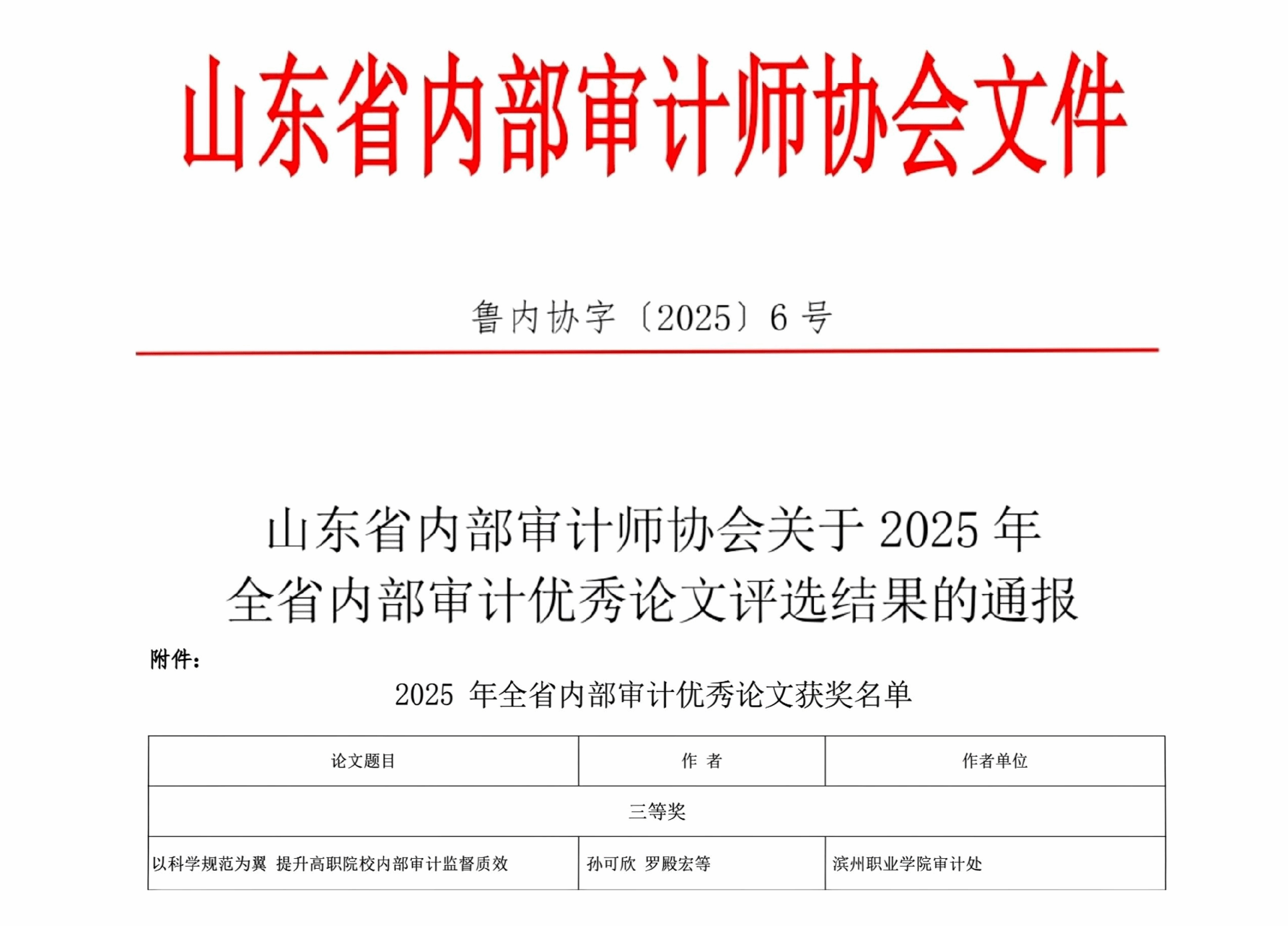 近日,山东省内部审计师协会印发《关于2025年全省内部审计优秀论文评选结果的通报》(鲁内协字〔2025〕6号),学校审计处组织撰写的论文《以科学规范为翼 提升高职院校内部审计监督质效》获评2025年全省内部审计优秀论文三等奖。